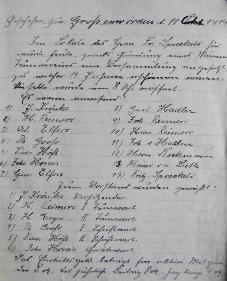 Aus dem ersten Protokoll ergibt sich, dass sich am 1. November 1919 14 Männer aus Großenwörden und Umgebung zusammenfanden, um einen Männerturnverein zu gründen. Sie trafen sich im Lokal Fritz Spreckels (heute: Großenwördener Hof) und wählten Lehrer Johannes Kröncke zu ihrem ersten 1. Vorsitzenden. Der Jahresbeitrag betrug damals gerade einmal 50 Pfennige.